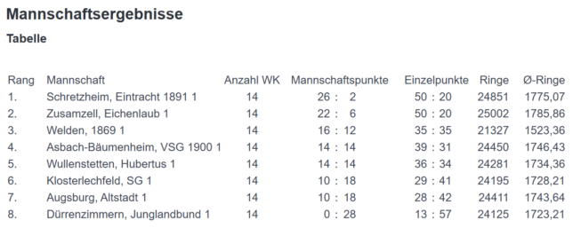 So wurde um Mannschaftsführer Christian eine in der Liga unbekannte Truppe ins letzte Rennen gegen Gastgeber Zusamzell geschickt. Mayr Josef deklassierte allerdings unseren Christian auf der Position 1, denn während der Schretzheimer mit 356 Ringen den Stand verließ, nutzte Josef die volle Zeit, um nochmal tolle 372 Ringe zum Besten zu geben. Paarung 2 war für Maximilian Wohlmann bestimmt. Er konnte der gesundheitlich angeschlagenen Kallenbach Bianca wirklich lange Paroli bieten, aber schließlich ging der Einzelpunkt mit dennoch tollen 353:360 Ringen an Zusamzell. Gegen Albrecht Thomas (355 Ringe) zog unser Gerhard Graf das Los. Er zielte zwar etwas zittrig, erreichte aber dennoch ordentliche 344 Ringe, mit denen er selbst nicht wirklich zufrieden war. Mit einer verjährten Quote stellte sich mal wieder Stefan Bäsche an den Stand. Unser Vorstand schaffte es vor geraumer Zeit, einmal in der Schwabenliga auszuhelfen und konnte tatsächlich mit 311:310 Ringen seinen Erfolg feiern. Von diesen 100% (Einmalig angetreten und dieses Duell auch gewonnen) erzählte er gerne, doch als „Lorbeeren“ für den Erfolg unseres LP-Quintetts opferte er nun diese Quote. Stefan erreichte auch an diesem Tag die sagenumwobenen 311 Ringe, jedoch gab Dietrich Bernd 353 Ringe auf Position 4 als Vorlage, wodurch an Zusamzell bereits der vierte Einzelpunkt spendiert wurde. Doch Johannes Dörle war nicht zu Scherzen aufgelegt und knallte nach einem etwas verunsicherten Start erneut tolle Serien in den Zählerkasten, sodass er schon bald mit hervorragenden 354 Ringen in Paarung 5 vom Stand ging. Da die Gastgeber einen weiteren gesundheitlichen Ausfall hatten, trat Glenk Werner gegen unseren jungen Pistolero an. Er konnte sich aber nur von hinten an Johannes herantasten und blieb bei 352 Ringen stehen, sodass unser Nachkömmling seinen Ersteinsatz in der Schwabenliga mit 100% (2 Wettkämpfe angetreten und beide gewonnen) feiern durfte. — Wir wünschen allen die es auf Seiten Zusamzell brauchen können: Gute Besserung und schnelle Genesung!