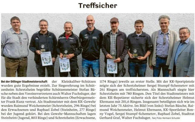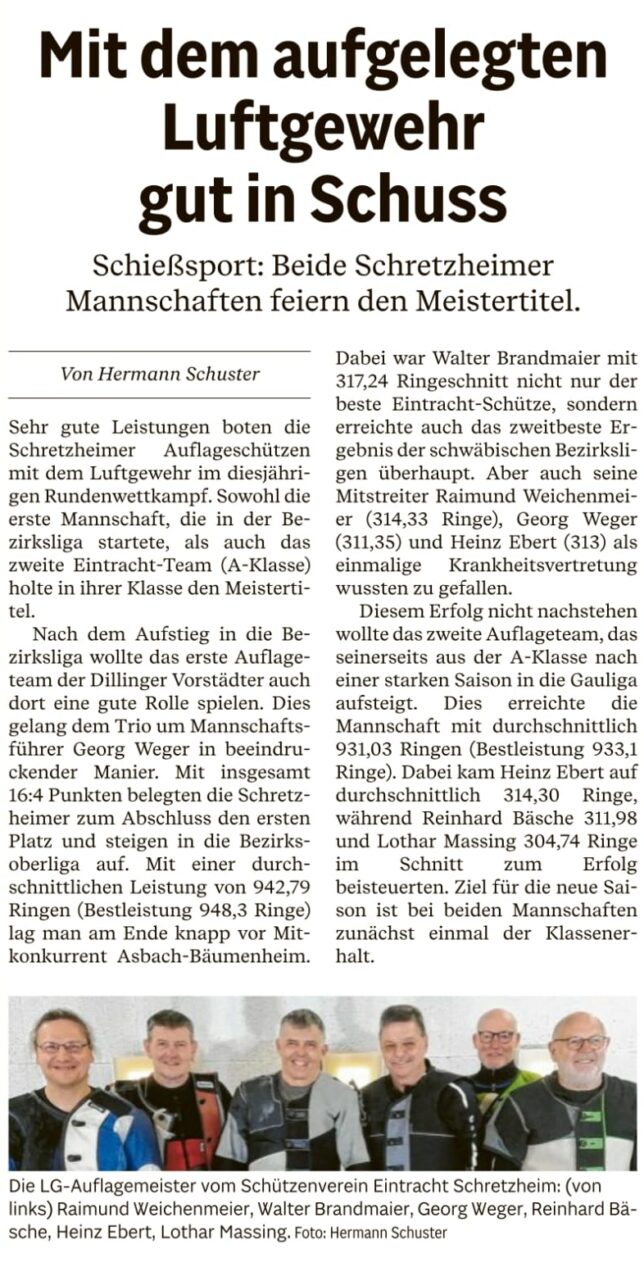 Stefan Gandenheimer war jetzt hellwach und zeigte Weigend Horst mit 367:352 Ringen sehr schnell die Schranken. Auch diesmal war der Punkt auf Position 3 für Christian Bäsche (nochmals 352 Ringe) einfacher zu holen, da Wiedemann Hermann ihm nur 331 Ringe vorlegen konnte. Somit gab es schon zwei Einzelpunkte für Schretzheim. Doch während Högg Alexander auf Position 2 zwischenzeitig mit einer 94 in Serie zwei gegen Julian Miehlich die Führung übernahm, sah es auch auf Position 4 sehr eng aus. Hier zog Ronny Vogel mit 353 Ringe am Ende gegen Müller Werner (356 Ringe) den Kürzeren. Doch Julian Miehlich kämpfte sich zurück und gewann mit 366:357 Ringen nicht nur den Einzelpunkt, sondern auch für den kommenden Wettkampf-Sonntag die Position 1 der Mannschaft. Alexander Römming holte auch diesmal den Punkt der 5. Paarung (349:337 Ringen gegen Flagner Werner), womit der Tag mit zwei 4:1-Siegen für die Schretzheimer einen wirklich erfolgreich war.